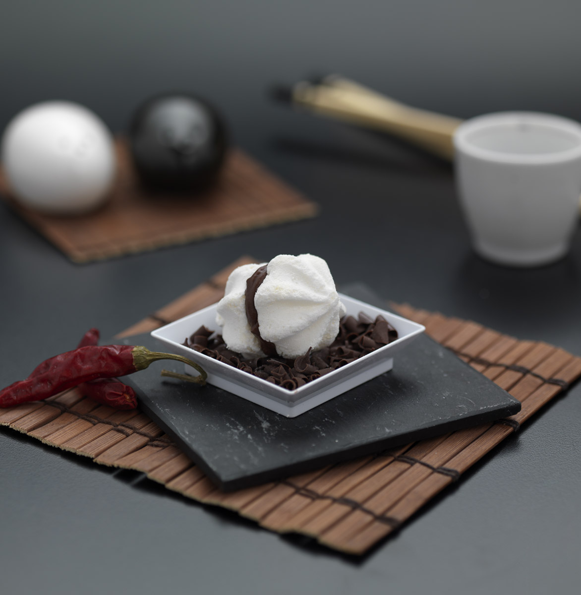 Preparare la crema facendo bollire il latte con i tuorli d’uovo, lo zucchero e la farina mescolando accuratamente per evitare la formazione di grumi. Sciogliere a bagnomaria il cioccolato e aggiungerlo alla crema calda. Raffreddare e aggiungere lo Zabov Classico, le spezie e la panna montata. Farcire gli spumini con la crema ben fredda e decorare con riccioli di cioccolato fondente.