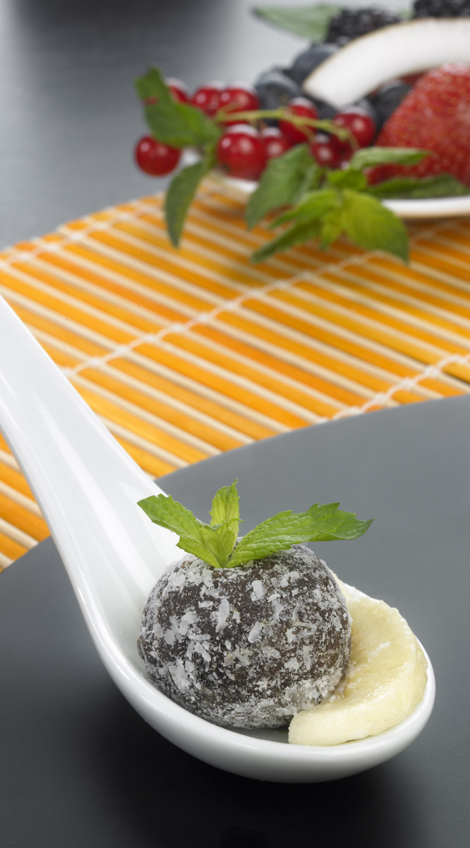 Impastare in un recipiente il pan di spagna (o i savoiardi) con lo zucchero a velo, il cacao amaro e lo Zabov classico. Se l’impasto risulta un po’ duro, aggiungere un po’ di panna liquida. Una volta pronto formare delle palline di media grandezza. Creare un incavo per poter inserire piccoli pezzi di banana e chiuderli utilizzando del nuovo impasto. Procedere nello stesso modo per gli altri tartufini e porli in frigorifero per 30 minuti. Successivamente farli rotolare nella granella di cocco e riporli nuovamente in frigorifero prima di servire. Decorare con foglie di menta e piccoli pezzi di banana.