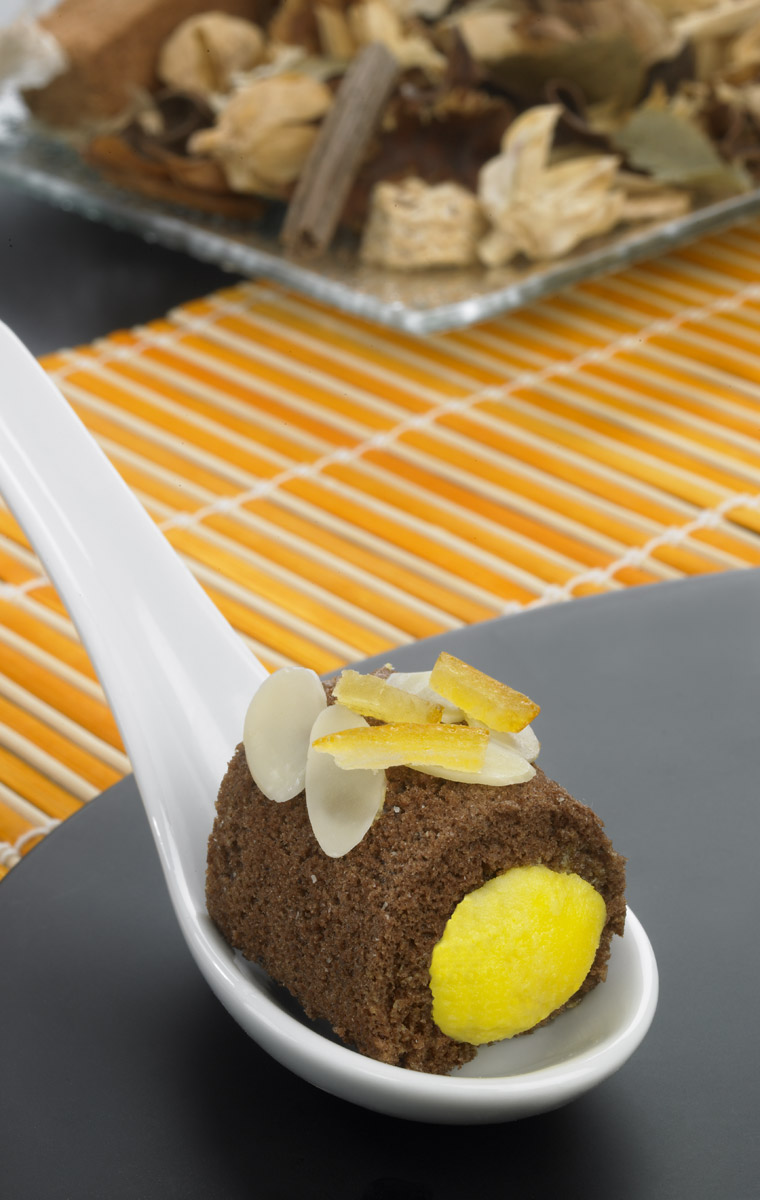 Formare uno strado di crema sul pan di spagna e arrotolare. Tagliare dei piccoli tronchetti e decorare con mandorle e pezzi di arancia candita.